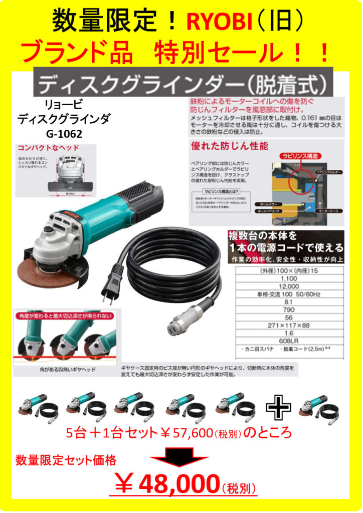 リョービ ディスクグラインダーセール(在庫限り) 投稿:2025年12月24日 キャンペーン リョービのディスクグラインダーのまとめ買いセールのお知らせです。 6台まとめてご購入いただいての特価となります。 本体と電源コードが着脱できるので、たとえば異なるディスクを装着した本体を取り替えることででき、用途によってディスクを付け替えるより簡単です。 また、コードが外れることで収納性にも優れます。 まとめ買いの恩恵は価格面だけでなく、作業の効率化につながります。 数量限定となっております。 ご興味ある方は当社営業までお問合せください。
