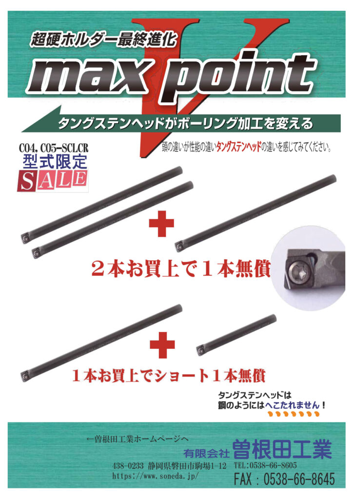 曽根田工業 maxVpointキャンペーン 投稿:2025年12月24日 キャンペーン 曽根田工業より、ボーリングバーのお得なキャンペーンのお知らせです。 C04-SCLCR/C05-SCLCR を・・・ ・2本ご購入で1本サービス ・1本ご購入でショート1本サービス となります! ぜひご検討ください。