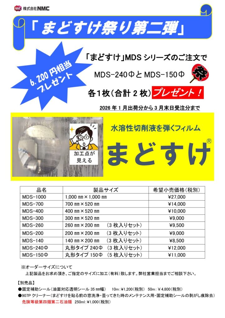 ㈱NMC まどすけ祭り(2026/3/31まで) 投稿:2026年01月20日 キャンペーン 「工作機械の窓に貼ることで外から加工点が見える」のが大変便利な まどすけ をご購入いただくと、丸形タイプが2枚(6200円相当)がもらえるキャンペーンです。 丸形タイプは角形タイプと異なり、貼る際の水平の傾きが気になりません。 当社ユーザー様でも大変好評です。 ぜひこの機会にお求めください! ※オーダーサイズにも対応可能です。ご相談ください。
