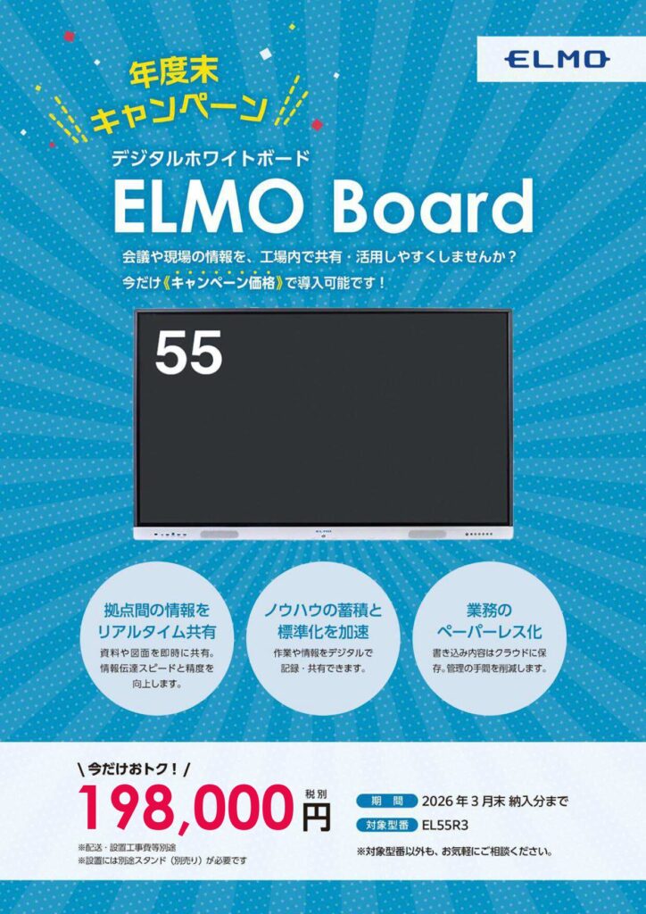 ELMO デジタルホワイトボード セール(2026年3月末まで) 投稿:2026年02月06日 キャンペーン ELMOよりデジタルホワイトボード「ELMO Board」55型の大特価セールのお知らせです。 現場内の工程管理などの情報共有にご採用を、この機会にぜひご検討ください。 【期間】 開催中~2026年3月末まで 【対象製品と特典】 55型「EL55R3」が198,000円のキャンペーン価格にてご提供 ※設置には別売スタンドが必要です。 導入のご検討の際のデモ使用につきましても、当社営業までご相談ください。
