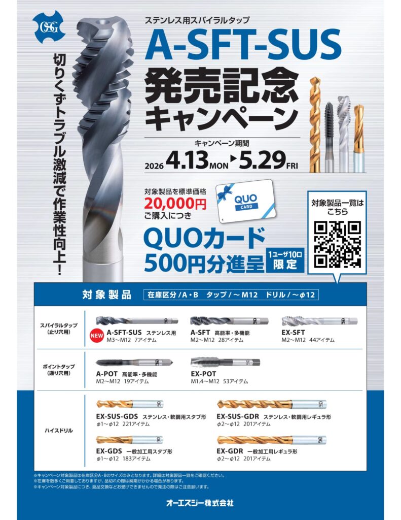 OSG ステンレス用スパイラルタップ 発売記念キャンペーン(4/13~5/29) 投稿:2026年04月06日 キャンペーン OSGより新製品発売を記念したキャンペーンが行われます。 新製品以外のご購入も対象です。この機会にまとめ買いがおすすめです。 【期間】 2026/4/13~5/29 【対象製品とキャンペーン特典】 ・新製品 ステンレス用スパイラルタップ A-SFT-SUS など ・ドリル EX-SUS-GDS など 標準価格20000円分ご購入でQUOカードご進呈 ※対象製品など、詳細は下記チラシをご覧ください