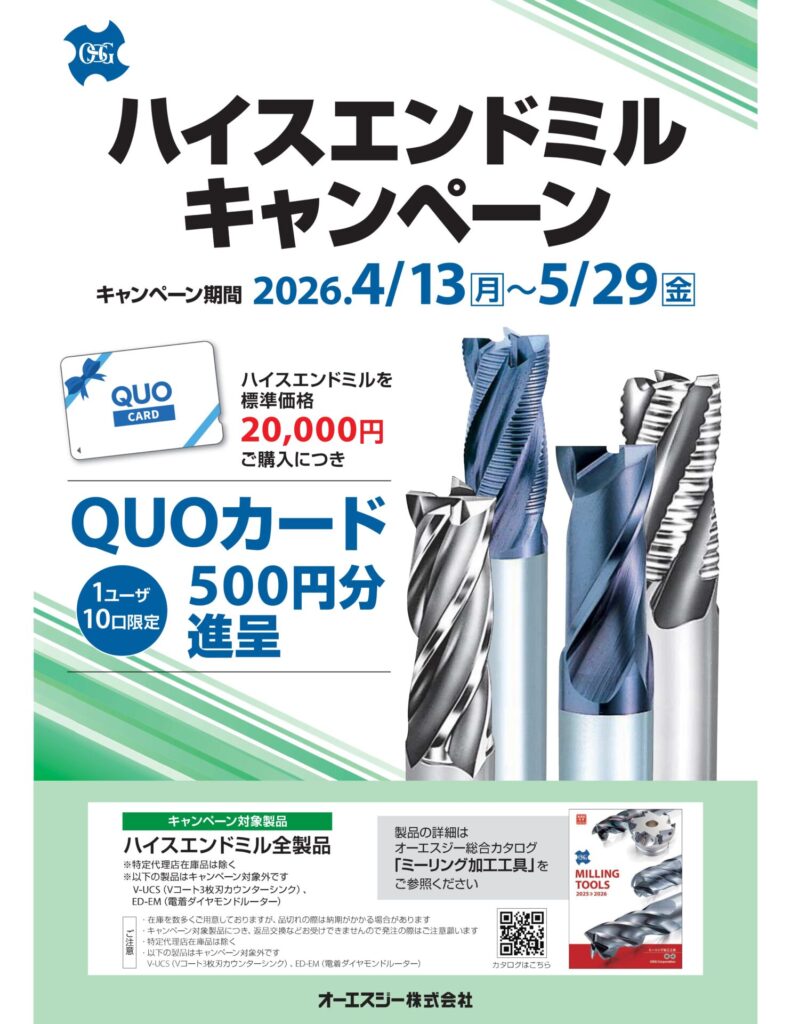 OSG ハイスエンドミルキャンペーン(4/13~5/29) 投稿:2026年04月06日 キャンペーン OSGより期間限定のキャンペーンのお知らせです。 【期間】 2026/4/13~5/29 【対象製品とキャンペーン特典】 ハイスエンドミル全製品(一部を除く)、標準価格20000円分ご購入でQUOカードご進呈 下記チラシもぜひご覧ください。