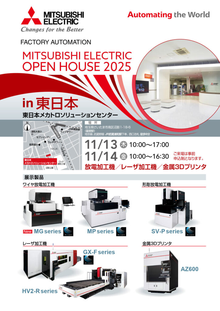 【展示会情報】三菱電機オープンハウス(11/13~14) 投稿:2025年10月10日 イベント 三菱電機の各種機械をご体験いただける展示会です。 事前のお申し込みが必要です。 各種セミナーも予定されております。下記チラシをご覧いただき、ぜひご参加ください。 【会期】 2025/11/13(木)~14(金) 【会場】 東日本メカトロソリューションセンター(埼玉県さいたま市) 【展示製品】 ・ワイヤ放電加工機 ・形彫放電加工機 ・レーザ加工機 ・金属3Dプリンタ