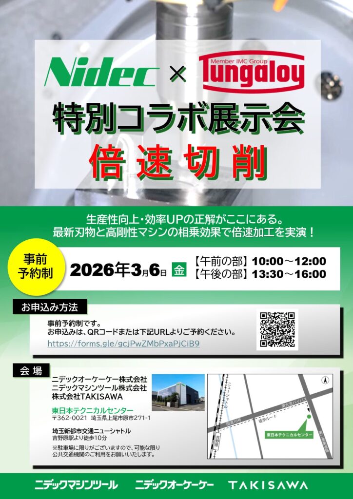 ニデック×タンガロイ コラボ展示会(2026/3/6) 投稿:2026年02月13日 イベント ニデックとタンガロイの特別コラボ展示会のお知らせです。 『「倍速加工」のご提案と実践』セミナー 新製品 立形マシニングセンタ「VN5」をはじめとした各種実演加工 など、お役に立つ情報が得られることと存じます。 事前予約制です。 ご興味がありましたら、当社営業までお問い合せください!