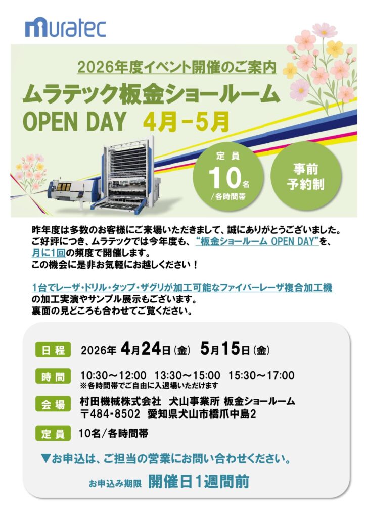 ムラテック 板金ショールーム OPENDAY(4/24、5/15) 投稿:2026年04月01日 イベント 村田機械のショールームにて、各種機械の実演がご覧いただけるイベントが開催されます。 事前申し込み制です。 ご興味がありましたら、当社営業までお問い合せください! 【日程】 2026/4/24(金)、5/15(金) 【会場】 村田機械株式会社 犬山事業所 板金ショールーム(愛知県犬山市橋爪中島2) 詳しくは下記チラシをご覧ください。