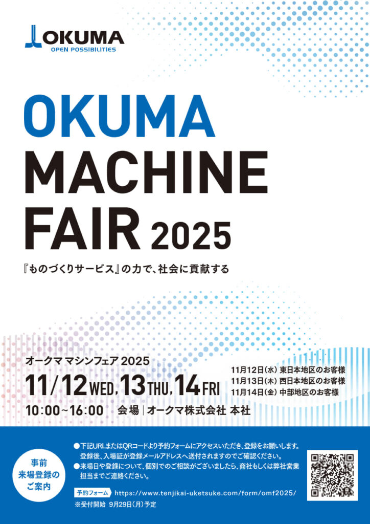 オークママシンフェア2025(11/12~14) 投稿:2025年09月26日 イベント, お知らせ オークマ㈱より、展示会のお知らせです。 「工程集約・自動化」による生産性向上ソリューションを提案いたします。 【会期】 11/12(水):東日本地区のお客様 11/13(木):西日本地区のお客様 11/14(金):中部地区のお客様 事前のご来場登録が必要です。 ぜひ下記チラシをご覧ください!