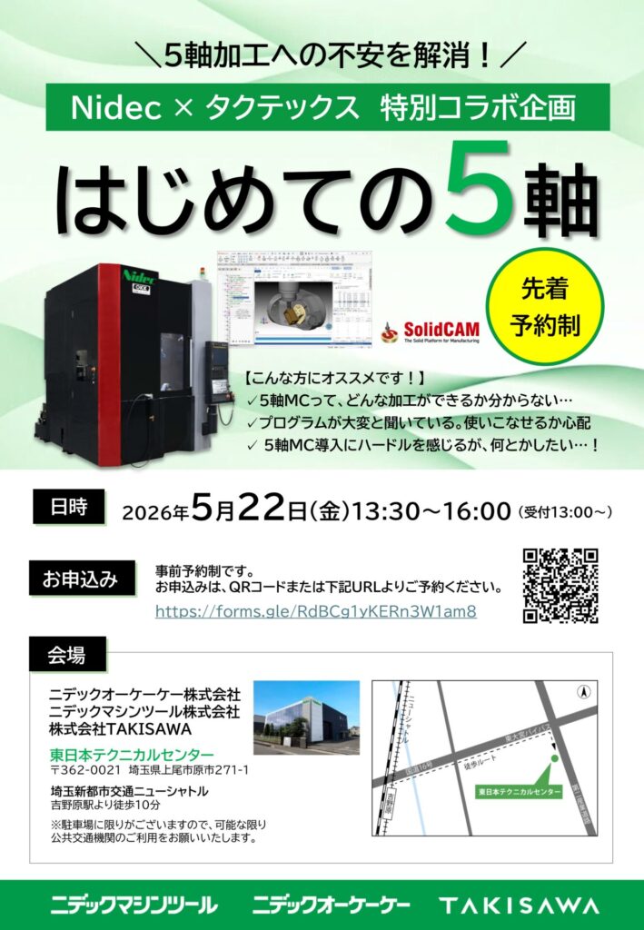 【展示会情報】Nidec x タクテックス 特別コラボ企画『はじめての5軸』 投稿:2026年04月28日 イベント, お知らせ ニデックによります展示会のお知らせです。 「5軸マシニングセンタの導入を考えているが心配・・・」という方向けのものとなっております。 もちろん、現在導入中の方でも多くの実機展示をご覧いただけますのでぜひご来場ください。 先着での事前予約制となっております。 詳しくはご案内チラシをご覧ください。 【日時】 2026/5/22(金)13:30~16:00 【会場】 ニデック 東日本テクニカルセンター(埼玉県上尾市)