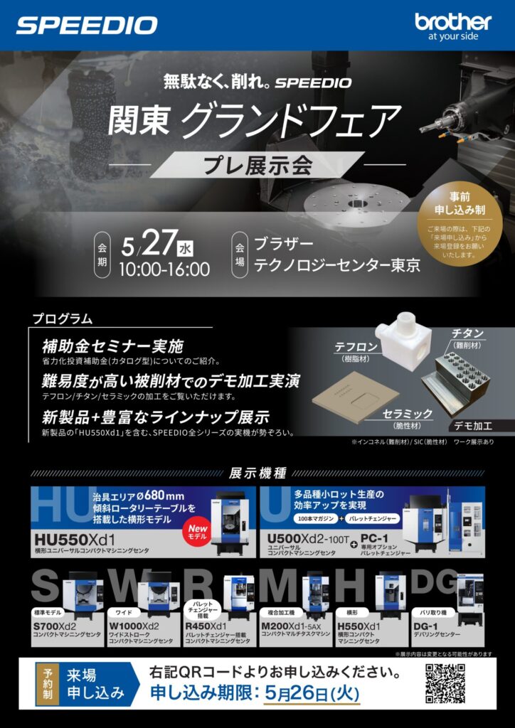 【展示会情報】ブラザー 関東グランドフェアプレ展示会(5/27) 投稿:2026年04月28日 イベント, お知らせ ブラザーによる展示会のお知らせです。 実機によるデモ加工や補助金セミナーも行われます。新製品もご覧いただけます。 事前予約をしていただき、ぜひご来場ください。 詳しくはご案内チラシをご覧ください。 【日時】 2026/5/27(水) 【会場】 ブラザーテクノロジーセンター東京(東京都江東区)